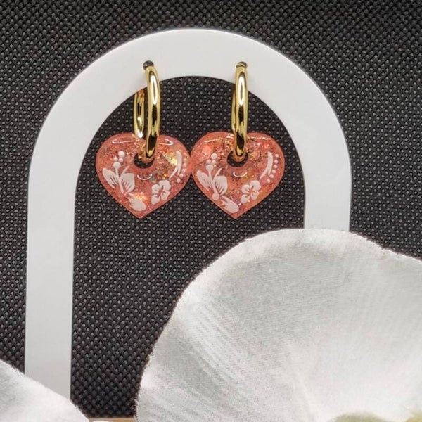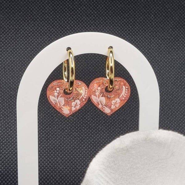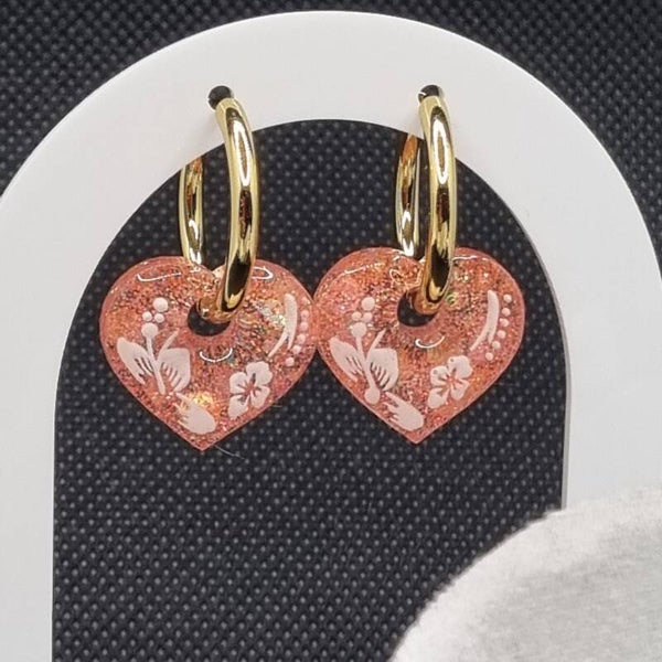 Boucles d'oreilles créoles en acier inoxydable et ses pampilles cœur rose pailletées décorées d'un côté de fleurs d'hibiscus blanches.