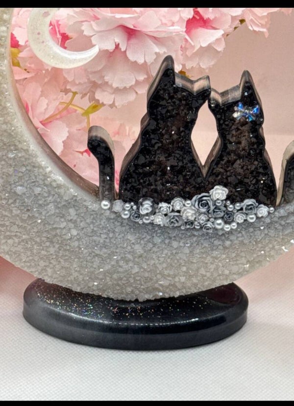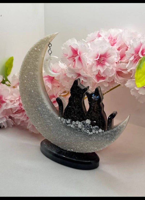 Couleurs noir et blanc et décoré de roses aux couleurs assorties, perles, et de sa petite lune suspendue blanc pailletée holographique