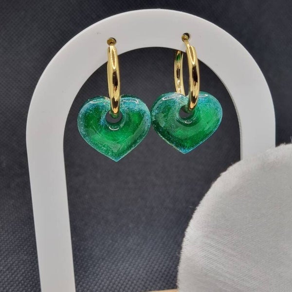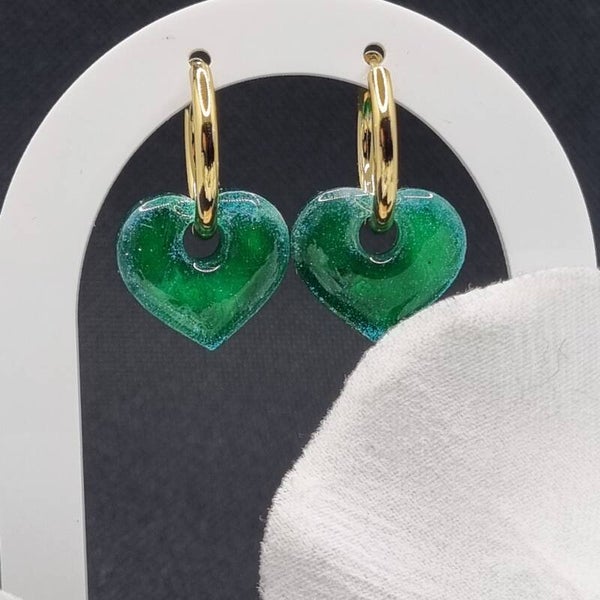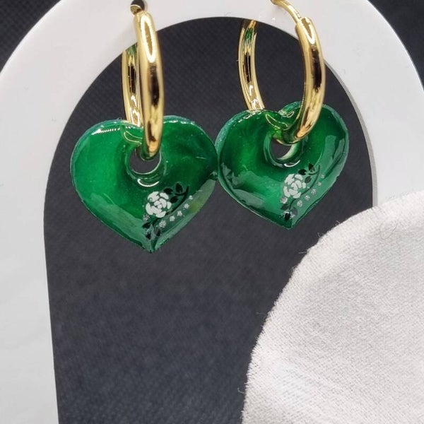 Boucles d'oreilles pampilles cœur verte décoré de fleur blanche