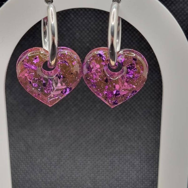 Boucles d'oreilles pampilles cœur rose feuille métal violette deco fleur argenté