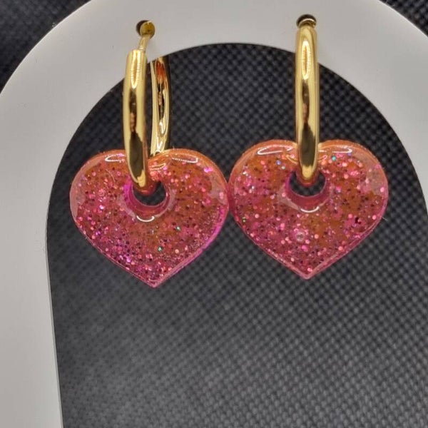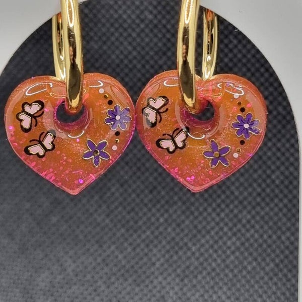 Boucles d'oreilles pampilles cœur rose paillettes decor fleurs violettes et papillons roses