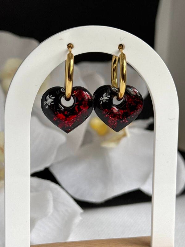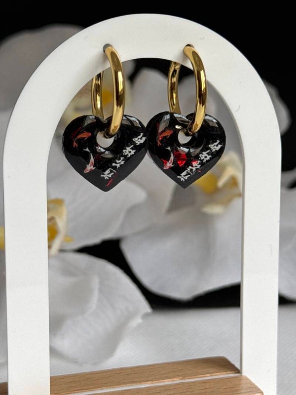 Boucles d'oreilles pampilles cœur noires et feuilles métal rouge décorées de poissons et inscriptions thème Asie