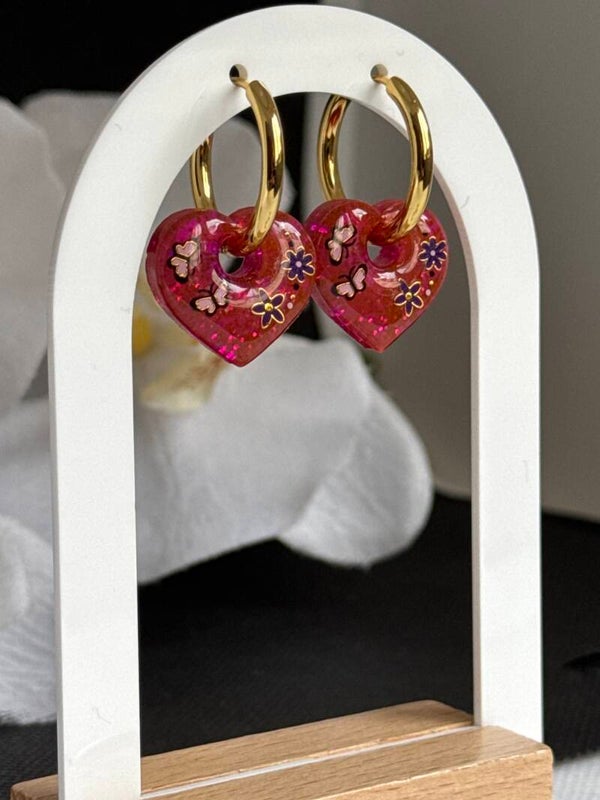 Boucles d'oreilles pampilles cœur rose pailletées décorées de deux papillons roses et fleurs violettes