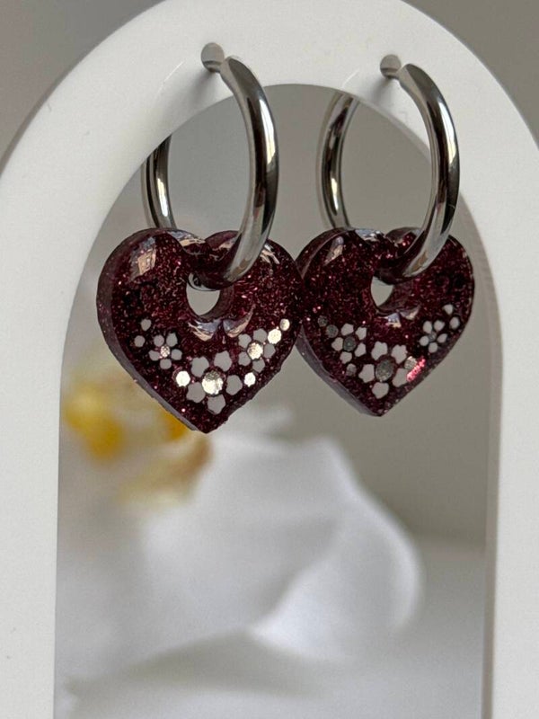 Boucles d'oreilles pampilles cœur couleur bordeaux pailletées décorées de ses fleurs blanches