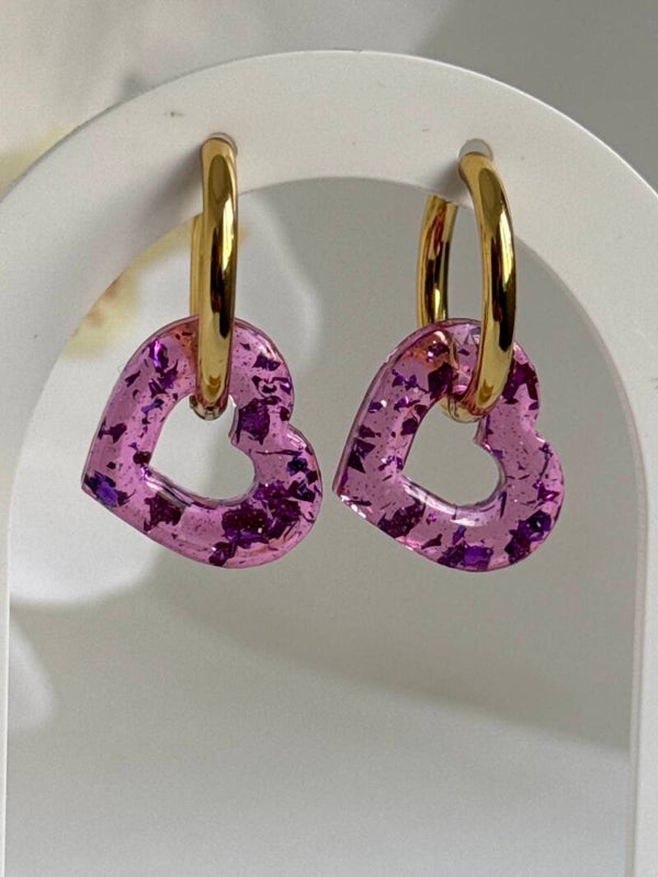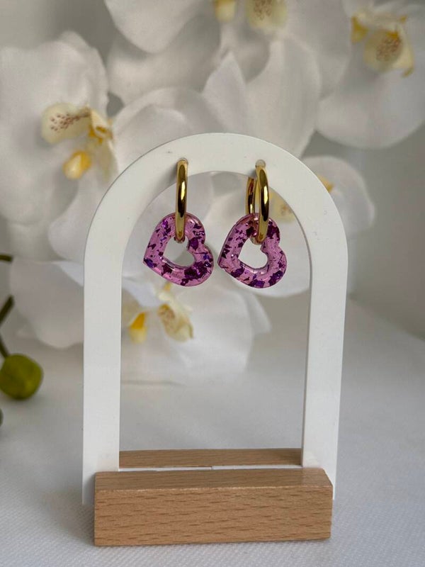 Boucles d'oreilles pampilles cœur creux violettes transparentes incrustées de feuilles métal violettes