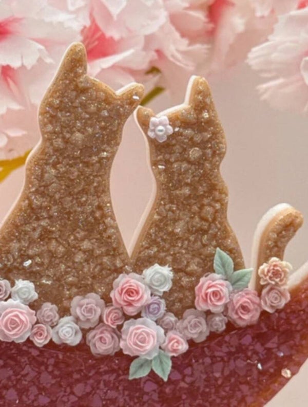Couleurs deux roses et décorés d'un lit de roses assorties, feuilles, et d'une lune blanche pailletée suspendue