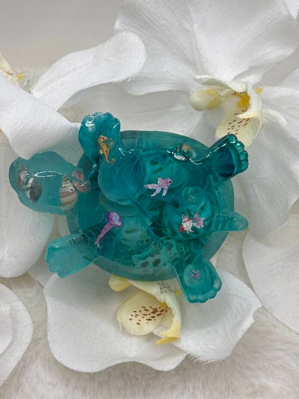 Figurine Tortue bi-effet ( brillant et mat ) incrustée de véritables coquillages et accompagnée de sa grenouille verte pailletée.