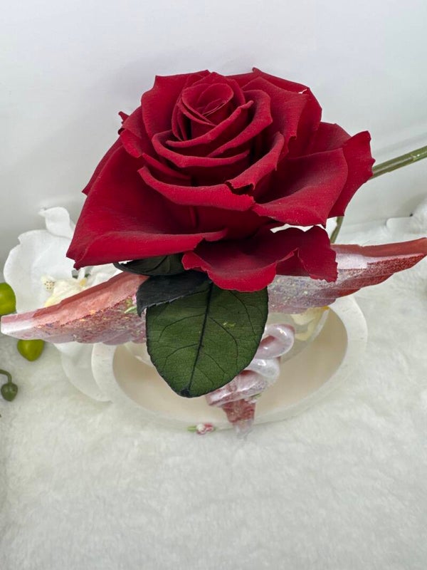Il est accompagné de sa ROSE ÉTERNELLE rouge dans le vase inclus.