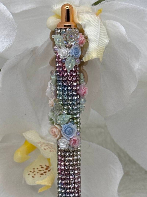 Stylo pailleté arc en ciel ( dégradé de couleur des strass ) décoré d'un Ours brun fille, de roses assorties, feuilles, cristaux strass , bulles....