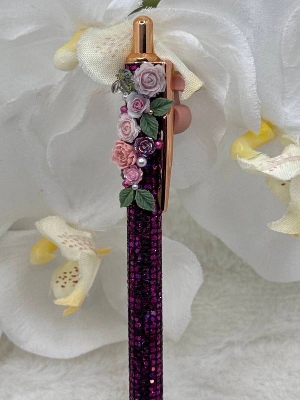 Stylo rose pailleté décoré de cerises , roses feuilles, couleur assorties, perles , abeille...