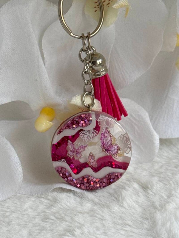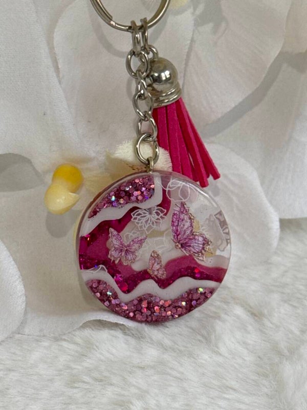 Réalisé en relief ( 3D ) il est décoré de ses papillons roses dans leur petit monde assorti pailleté.