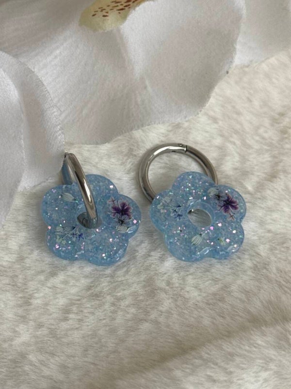 Boucles d'oreilles pampilles fleurs bleues ciel pailletées.