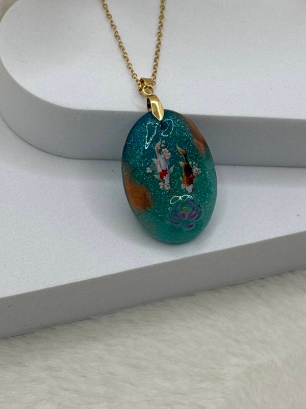 Couleurs vert paillettes et or il est décoré thème Asie : de ses carpes koi et son lotus en relief