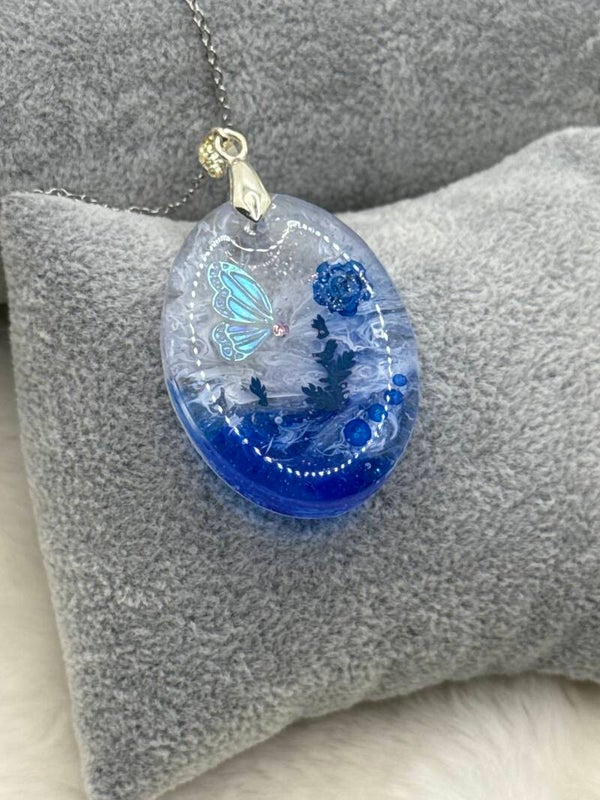 Couleur bleu et fumé blanc il est décoré d'un papillon, feuilles, rose, billes bleues