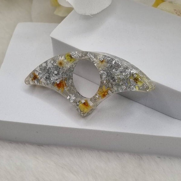 Transparente incrustée de feuilles argent et fleurs séchées oranges et jaunes