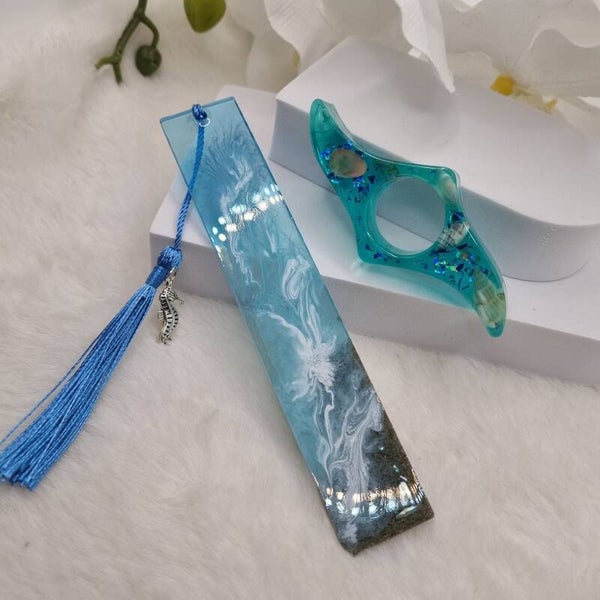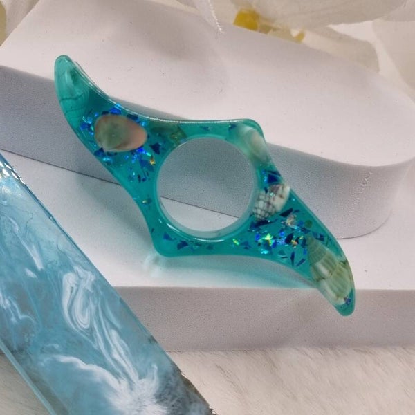 1 bague de lecture forme vague incrusde feuilles métal et véritables coquillages