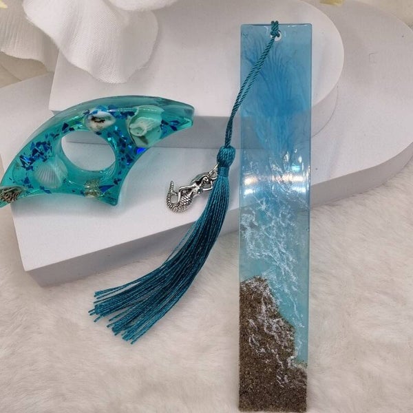 1 bague de lecture forme éventail bleu océan incrustée de paillettes et véritables coquillages