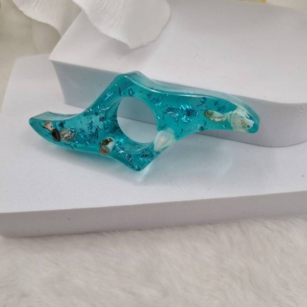 Couleur océan incrustée de feuilles métal turquoise et véritables coquillages et son effet écume