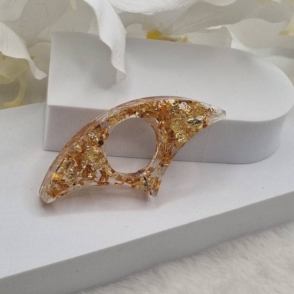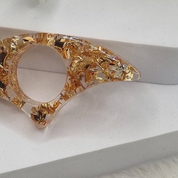 Transparente incrustée de feuilles or et cuivre elle est décorée de fleurs aux extrémités