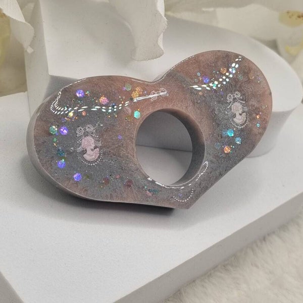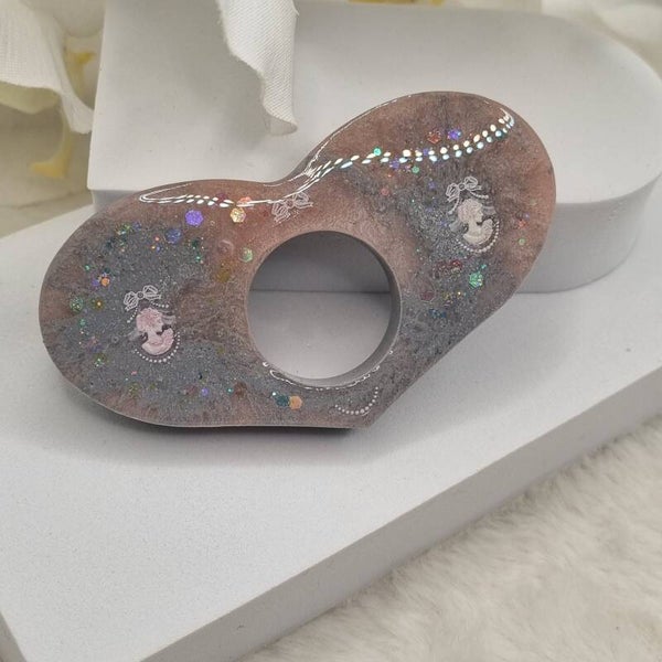 Couleurs rose et grise marbré elle est décorée de paillettes et de camée