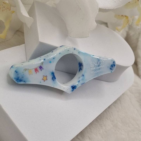 Couleurs blanc et feuilles métal bleu elle est décorée sur le thème des vacances