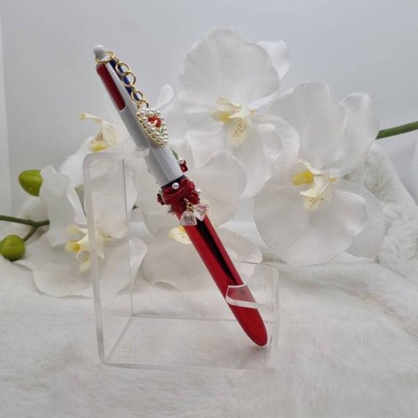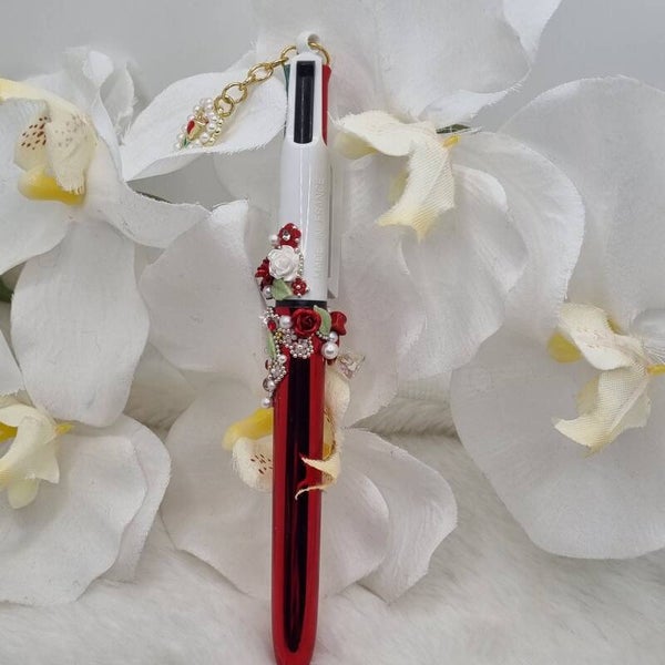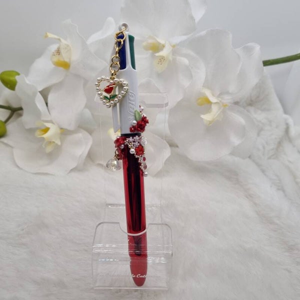 Il est décoré de roses rouge métal, fleurs, feuilles, perles, billes, flot rouge... il est accompagné d'un charm cœur de perle et sa rose rouge