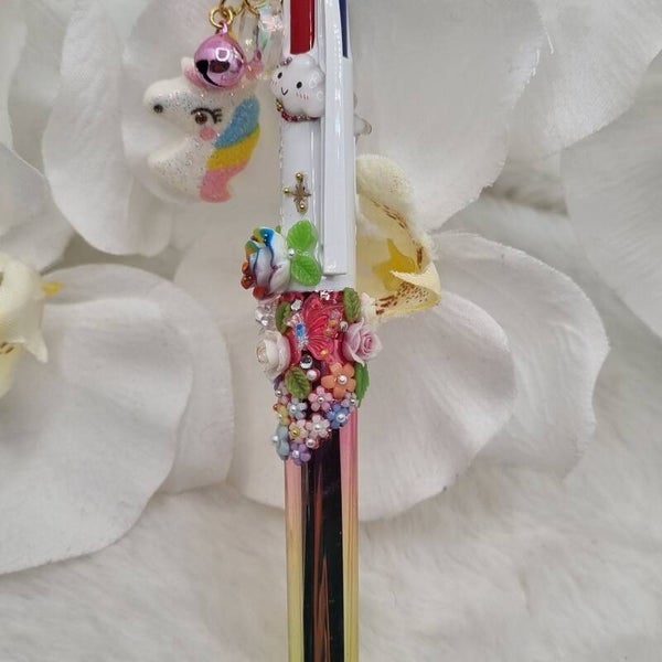Il est décoré de roses , fleurs multicolores, perles, petit nuage kawai, billes, papillon, paillettes...