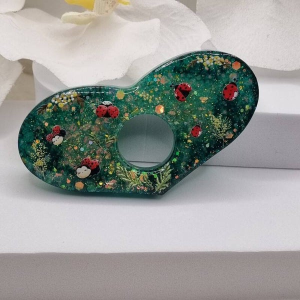 Couleur vert et paillettes elle est décorée de coccinelles et fleurs type mimosa