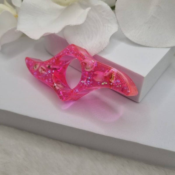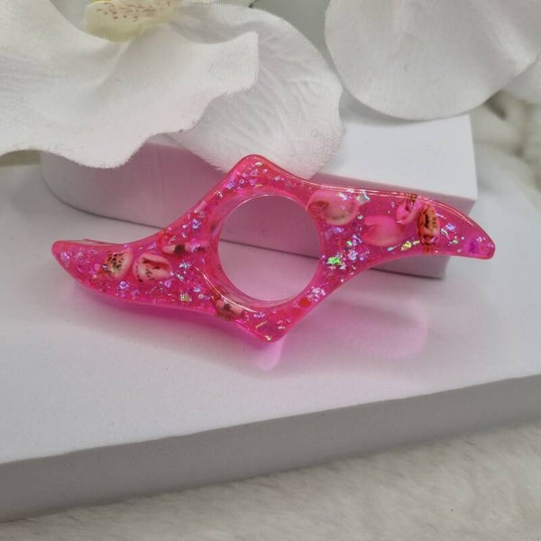 Couleur rose incrustée de paillettes holographique et véritables coquillages elle est décorée de bambou er ses petit poissons holographiques