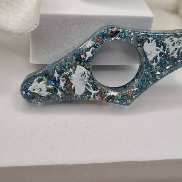 Couleur bleu full paillettes holographiques elle est décorée de fleurs blanches perlées